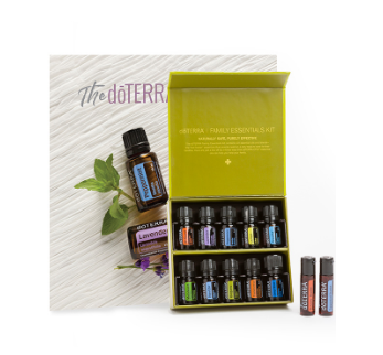 • Family Essentials Kit, which contains a 5 mL oil of each: Lavender, Lemon, Peppermint, Melaleuca, Oregano, Frankincense, Deep Blue, doTERRA Air, ZenGest, and doTERRA OnGuard