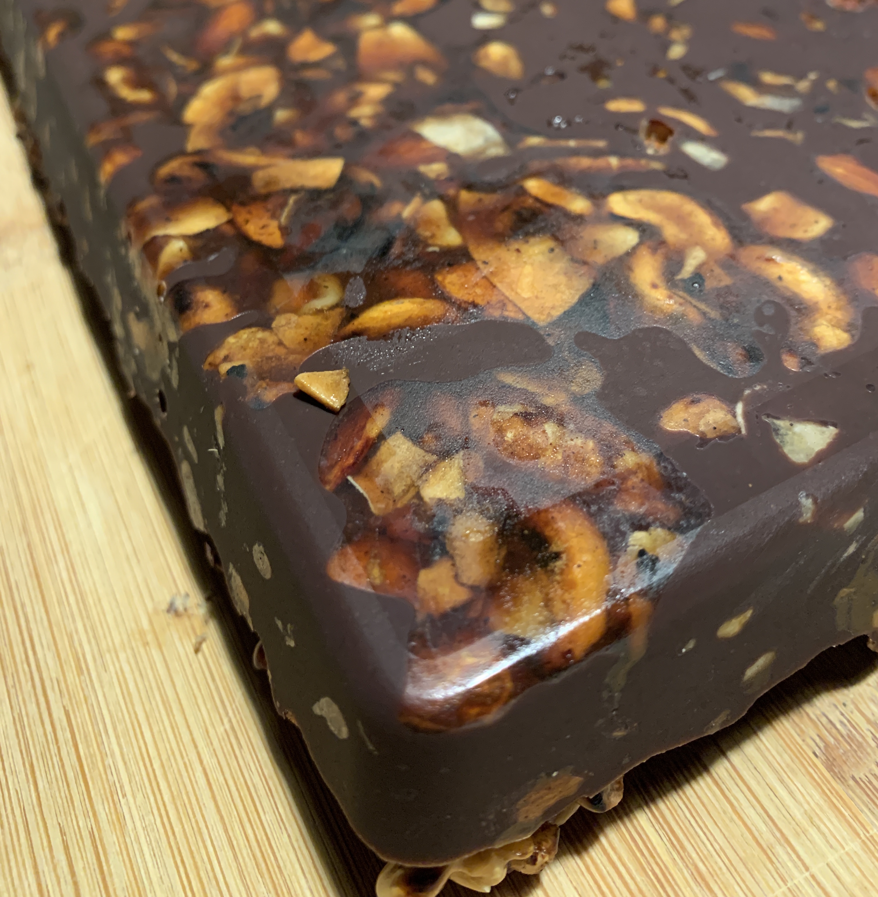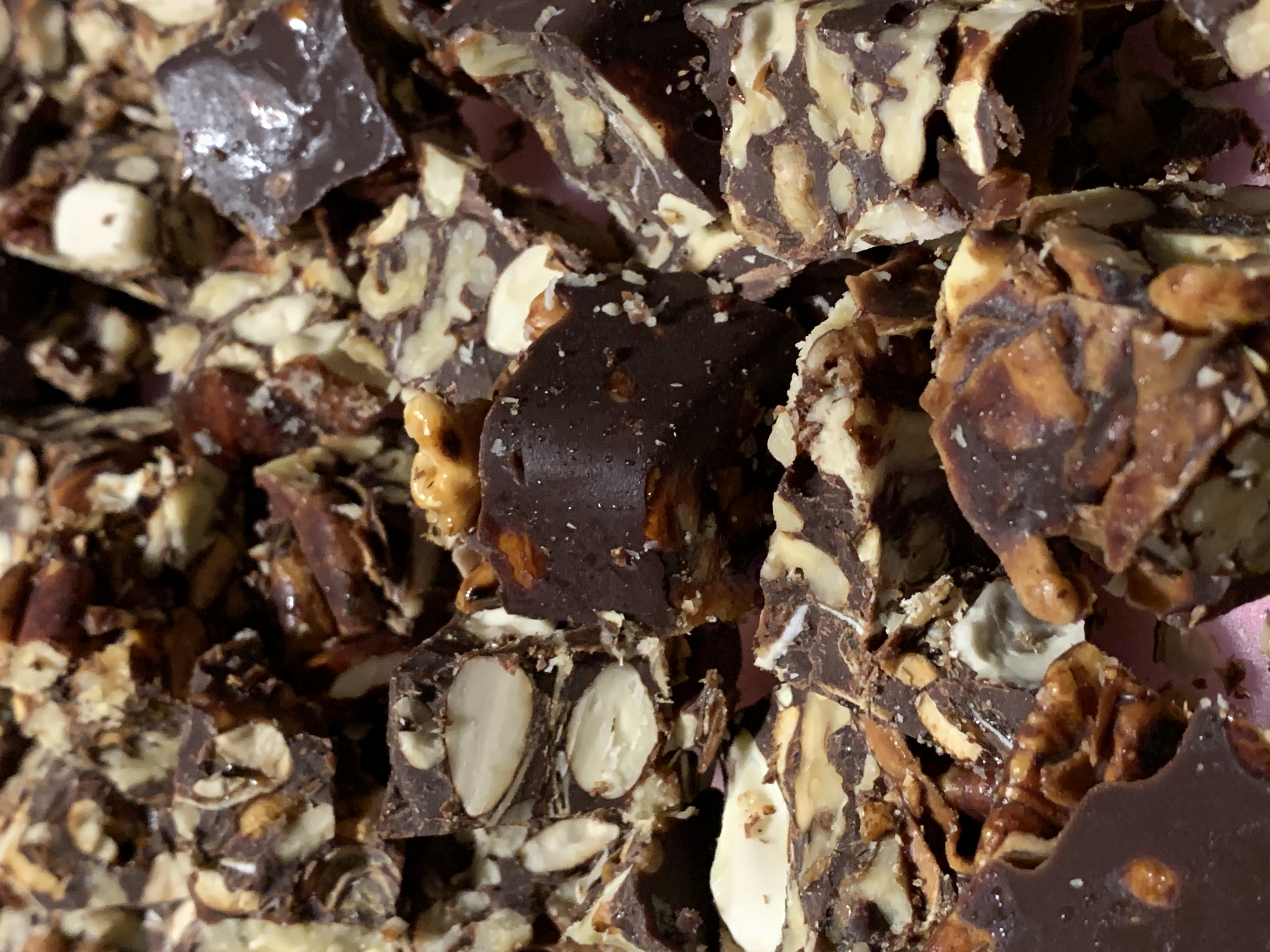 This slab has several different nuts with a dark chocolate infused with Cardamom essential oil.
